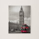 Ein roter Bus des doppelten Deckers, der vor dem Big Benclocktower und -parlaments-Gebäude in London England überschreitet.