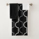 Dieses Set ist mit einem weißen Waschlappen, einem schwarzen Handtuch und einem Badehandtuch mit einem Deko-Design aus weißen Halbkreisen ausgestattet, das mit Linien auf einem schwarzen Feld verbunden ist.