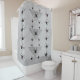 This shower curtain for your bathroom has a light grey background with a bunch of creepy crawly black widow spiders with red hourglass markings and black triangle shaped spider webs.