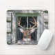 großer Buck mit Anglern, die aus rustikalem Kabinenfenster schauen