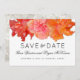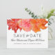 Orange Hibiskus Save the Date Hochzeitsankündigung für eine hawaiianische Tropenheirat. Drei exotische Hibiskus-Blume aus dunkelrosa, hellrosa und orange machen einen breiten Rahmen an der Spitze der weißen Karten mit schwarzem Text mit Platz, um die vollständigen Namen des Paares zu enthalten.