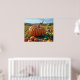 A massive pumpkin dominates the foreground of a sprawling pumpkin patch. The vibrant orange and green hues stand out under the warm light of a setting sun, with an expansive landscape in the background