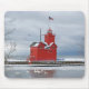 Grosser roter Leuchtturm im Winter mit Schwänen.