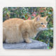 wunderschöne Katze mit grünen Augen, die an einer Wand sitzt, Blätter im Hintergrund sind fallweise gefärbt