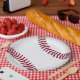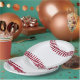 Extreme nahe Aufnahme eines weißen Baseballs mit roter Naht