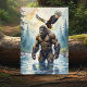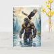 Bigfoot Geburtskarte. Ein muskulöser Sasquatch mit einem Adler, der auf seiner Schulter landet, während er durch einen Fluss in einem Wald spaziert.