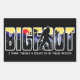 Hast du mich gesehen? Überall gibt es eine große Geschichte zu erzählen. Es gibt so viele Shows über den großen Fuß. Er geht auch unter vielen Namen. Bigfoot, Sasquatch, yeti (nur hoch in den Bergen) Skunk ape, yowie, der Grasmann, nur um ein paar zu nennen. Dieser Aufkleber ist im Wald im Wort BIGFOOT Set. Die Sonne geht unter und ein großer, hellroter Ball in einem gelben Himmel. Die dunklen Bäume und die blauen Berge Set als Hintergrund. Die Silhouette des größten Fußes in seiner berühmten Position zu Fuß nach vorne und in Weiß umrissen.