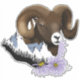A portrait of a Ram / Bighorn Sheep with mountains and flowers.