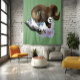 Ein Portrait eines Ram / Bighorn Sheep mit Bergen und violetten Blumen in einem grünen Hintergrund