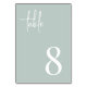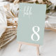 Einfache und schicke Tischnummer-Karten in Sage Green und Weiß machen eine elegante Aussage bei Ihrer Hochzeit oder Veranstaltung. Das Design enthält "table" in handgeschriebenen Schriftzeichen, mit der Tischnummer unten rechts in zeitloser Serifentypografie. Design wiederholt sich auf beiden Seiten.