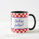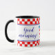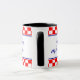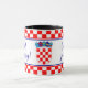 Diese marineblaue Combo-Tasse bietet auf der einen Seite einen kroatischen Gruß "Dobro jutro!" und auf der anderen Seite die englische Version "Good Morge!". Auf der oberen und unteren Seite des karierten Musters befinden sich zwei Reihen mit roten und weißen Schachbrettern sowie dünne rote, weiße und blaue Streifen. Der Text ist anpassbar, und der blaue Schriftart entspricht der Farbe der kroatischen Fahne. In der Mitte befindet sich das Wappen (griechisch). Gute Geschenkidee für zweisprachige Kroaten.