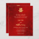 Diese Version hat eine Überschrift, um die Hochzeit der Eltern der Braut und Bräutigam bekannt zu geben. Diese elegante chinesische Hochzeitseinladung besticht durch ein künstlerisches Gold-Doppelglückssymbol auf einem blumenrubinroten Hintergrund. Braut und Bräutigam Namen in einem eleganten, handgeschriebenen Skript. Einladung zur chinesischen Hochzeit oder Teezeremonie.