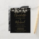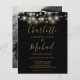 Mit hübschen Stringleuchten und Signaturstil-Namen. Dieses elegante Budget Schwarz und Gold Hochzeitseinladung kann mit Ihren Hochzeitsdetails in schicken Schriften und speziellem Foto auf der Rückseite personalisiert werden. Entwickelt von Thisisnotme©