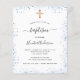 Eine moderne, elegante Taufe, die einen kleinen Jungen feiert. Ein stilvoller weißer Hintergrund mit blauen Imitaten, Staub aus Glitzer und einem goldenen Kreuz. Personalisieren und fügen Sie einen Namen und Party-Details hinzu. Schwarze Buchstaben.