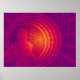 Ein lebendiges Neonbild mit binärem Code und einem hellen Sonnenbrand und Kreisen. In lila, orange und rosa. Eine Kontur einer Person scheint von all der Hochtechnologie / dem Code, der sich in Richtung der Singularität bewegt, die durch den hellen Sonnenbrand im Hintergrund repräsentiert wird, konsumiert und absorbiert zu werden.