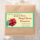 Ein paar Kirschen mit Stamm und Blatt sind in der links unteren Ecke dieses Etiketts mit einem hellgelben Hintergrund versteckt, umgeben von einem Rand und einem Hintergrund von mäßig türkisfarbenem Grün, was dieses Etikett zu einem perfekten Etikett für die Gläser hausgemachten Kirschmarmeles oder Konfitüren macht. Der Text befindet sich im Vorlagenformular, sodass Sie ihn auf das ändern können, was Sie möchten.