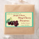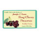 Ein paar Kirschen mit Stamm und Blatt sind in der links unteren Ecke dieses Etiketts mit einem hellgelben Hintergrund versteckt, umgeben von einem Rand und einem Hintergrund von mäßig türkisfarbenem Grün, was dieses Etikett zu einem perfekten Etikett für die Gläser hausgemachten Kirschmarmeles oder Konfitüren macht. Der Text befindet sich im Vorlagenformular, sodass Sie ihn auf das ändern können, was Sie möchten.