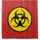 Roter Duschvorhang mit einem Warnsymbol für die Biogefährdung in Schwarz und Gelb.