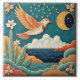 Ceramic tile art featuring a bird in flight, with orange and white plumage, set against a teal sky dotted with white stars. A yellow moon with floral accents and a dark blue crescent is visible in the upper right corner. Below, a landscape with a body of water, white clouds, and orange-toned land formations is depicted. The foreground includes stylized plants and flowers in shades of green, white, and orange.