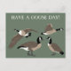 Senden Sie Ihren Lieblingsvogelliebhabern mit dieser individuell gestaltbaren Postkarte den perfekten Gruß. Die Nachricht "HAVE A GOOSE DAY!" auf der Vorderseite kann mit Ihrem eigenen Sprichwort angepasst werden. Außerdem gibt es genug Platz, um Ihre eigene Nachricht zu schreiben. Diese Postkarte zeigt realistische Stilbilder von kanadischen Gänsen in Braun, Schwarz und Weiß vor einem schlauen grünen Hintergrund.