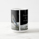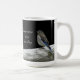 A mug with a photo of a bird perched on a fence against a black background