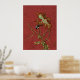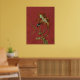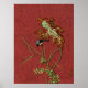Dieses Kunstwerk von G.A. Audsley, das in Abschnitt V Plate V seiner Sammlung vorgestellt wird, zeigt einen wunderschön detaillierten japanischen Vogel- und Pflanze-Druck. Der Hintergrund ist reich dunkelrot mit unregelmäßigen schwarzen vertikalen Streifen und Flecken, was einen auffallenden Kontrast zum Vordergrund schafft. In der Mitte steht ein Vogel am Stamm eines großen Lotusblattes, der die zarten Blume um sich herum anscheinend bewundert. Die Gesamtkomposition spiegelt den aufwändigen und anmutigen Stil wider, der für Audsleys Werk typisch ist und natürliche Elemente mit dekorativem Design kombiniert.