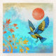 Dieses wunderschöne Design zeigt einen blauen und goldenen Vogel, der eine Landung auf einem goldenen Baum mit einem schönen Himmel mit vielen blauen Farben und einer kühlen orangen Sonne.