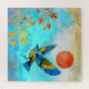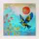 Dieses wunderschöne Design zeigt einen blauen und goldenen Vogel, der eine Landung auf einem goldenen Baum mit einem schönen Himmel mit vielen blauen Farben und einer kühlen orangen Sonne.