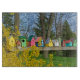 Dieses Glasschneidebrett zeigt eine Reihe von farbenfrohen Vogelhäusern, die sich in der Frühlingssonne stürzen. Ein gelber Gabeldorsch, Bäume, blauer Himmel und grünes Gras bilden den Rahmen für einzigartige Vogelhäuser. Zeigen Sie Ihre Liebe für gefiederte Freunde und ihre Vogelhäuser.