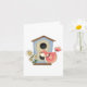 Ein niedlicher Vogel steht vor einem Vogelhaus. Dieses Design sieht auf dieser Grußkarte wirklich effektiv aus