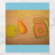 Eine Aquarellzeichnung einer Birne und eines Apfels mit einem rosa Krug
