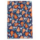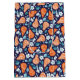 Dekorative gemusterte Birnen und Blätter in Orange, Minze und aquamarin, umgeben von weißen Blüten auf einem schlicht marineblauen Hintergrund.