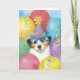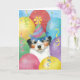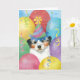 Herzlichen Glückwunsch zum Geburtstag mit diesem niedlichen Design mit einem lächelnden, Party-Hut tragenden australischen Shepherd Welpen, umgeben von bunten Ballons, Konfetti und Streamern.