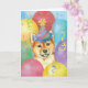 Herzlichen Glückwunsch zum Geburtstag mit diesem niedlichen Design mit einem lächelnden, Party-Hut tragende Shiba Inu Welpe umgeben von bunten Ballons, Konfetti und Streamern.