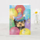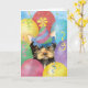 Herzlichen Glückwunsch zum Geburtstag mit diesem Design, das ein niedliches, Party tragendes Yorkshire Terrier Welpen, umgeben von bunten Ballons, Konfetti und Bambus.