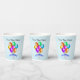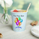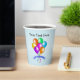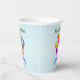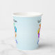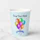 Diese Papiertassen sind hellblau mit einem Haufen farbenfroher Ballons in mehreren Farben, die passenden Bänder hängen und einem blauen Banner, das Happy Birthday sagt. Passen Sie Ihren Text mit den Vorlagen auf der Vorder- und Rückseite an.