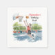 Eine energische Abbildung eines jungen Jungen im Mittelsprung, der sich auf einem Basketballplatz im Freien aufhält, umgeben von einer lebhaften Menge jubelnder Zuschauer. Mit lebendigen Farben und dynamischer Bewegung erweckt diese Szene die Begeisterung für eine Geburtstagsparty im Basketballthema. Ideal für Einladungen, Party-Plakate oder Gedächtnisbücher, die den besonderen Tag eines sportlichen Kindes feiern.