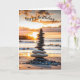 Stein Cairn am Strand mit Sonnenuntergang Himmel und Ozeanwellen zum Geburtstag. Alle Texte können geändert werden.