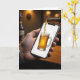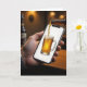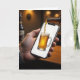 Die Hand eines Mannes hält ein Smartphone, das ein Bild einer Bierbläser-Tasse zeigt, während das Bier aus einer Flasche in die Tasse gegossen wird.