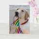Labrador Retriever am Strand mit einem farbenfrohen gestreiften Bikini-Top in seinem Mund zum humorvollen Geburtstag.