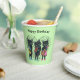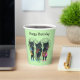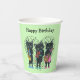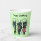 Diese Papiertassen sind grün mit drei schwarzen Musikkatzen in bunten Kleidern aus rosa, blau und grün spielenden Musikinstrumenten auf einem Herzen aus schwarzen Musiknoten. Passen Sie den Happy Birthday Text mit den Vorlagen vorne und hinten an.
