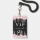 Ein modernes, stilvolles und glamouröses Abzeichen für eine 21. Geburtstagsfeier (oder jedes Alter). Ein schwarzer Hintergrund mit rosa Imitate Glitzer Tropfen, Farbe Tropfausdruck aussehen. Personalisieren und einen Namen hinzufügen. Der Name wird mit einem modernen handgeschriebenen Stilskript mit Swashes geschrieben. Der Text: VIP Nummer 21 ist in einer rosa Farbe geschrieben. Um die Swashes behalten, löschen Sie nur den Beispielnamen, verlass die Leerzeichen oder Emoji's vor und nach dem Namen. Zurück: Ihre Party-Details.