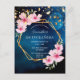 Eine tropische Blüte unter den Sternen Quinceañera, 15. (oder jedes Alter) Geburtstagsfeier Einladung mit rosa Hibiskus Blume, Grün und einem Imitat goldenen geometrischen Rahmen. Ein dunkelblauer Nachthimmel mit Vollmond und Imitaten goldenen Sternen als Hintergrund. Vorlagen für einen Namen, der mit einem modernen Stilskript geschrieben wurde, Vorlagen für Ihre Party-Informationen. Weißer Text. Ideal für einen Sommer-, Pool- oder Strandurlaub! Zurück: blauer Himmel und Sterne als Hintergrund.