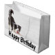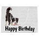 Spielender Border Collie Hund auf einem weißgetünchten Holzhintergrund mit schwarzem Happy Birthday Text. Das Hintergrundmuster kann geändert werden.
