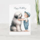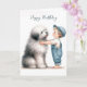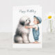 Ein kleiner Barfußjunge in blauen Overalls und eine passende Mütze umarmen einen großen, flauschigen Hund zum Geburtstag. Alle Texte können geändert werden.