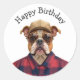 Ein Bulldogge trägt eine Sonnenbrille, eine beige Kappe und ein Buffalo-kariertes Shirt. Die weiße Hintergrundfarbe kann geändert werden. Alle Texte können bearbeitet werden.
