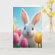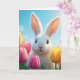 Ein flauschiges weißes Kaninchen mit großen Ohren ist von farbenfrohen Tulpen umgeben, die unter einem hellen, sonnigen Himmel liegen. Der Text kann geändert werden.