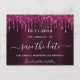 Eine Save the Date Karte für eine 21. Geburtstagsparty (oder jedes Alter). Ein tiefbordeauxroter Hintergrund mit Imitaten Glitzer Tropfen, Maltropfen Aussehen. Personalisieren und fügen Sie Datum und Name/Alter hinzu. Der Text: Save the Date wird mit einem handgeschriebenen Style-Skript mit Swashes geschrieben.