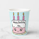 Niedliche Geburtstag Kuchen Papiertasse, in Rosa und Weiß mit fröhlichem Geburtstag, Name und Bluebackground dekoriert. In meinem Geschäft finden Sie passende Designelemente.