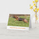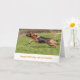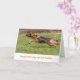 Glückliche Geburtstagskarte mit einem Foto eines deutschen Schäferhundes, der glücklich über das Gras läuft und den Ball verfolgt.